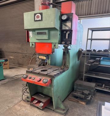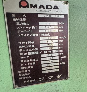 Available for sale is a used Amada Model SPH-30C C-Frame Hydraulic Press, manufactured in Japan. Amada is a world-renowned brand known for its high-quality and durable machinery, and this press is a prime example of their robust engineering from 1980. With a formidable 30-ton capacity, it is designed for a wide range of applications including stamping, forming, and assembly work.