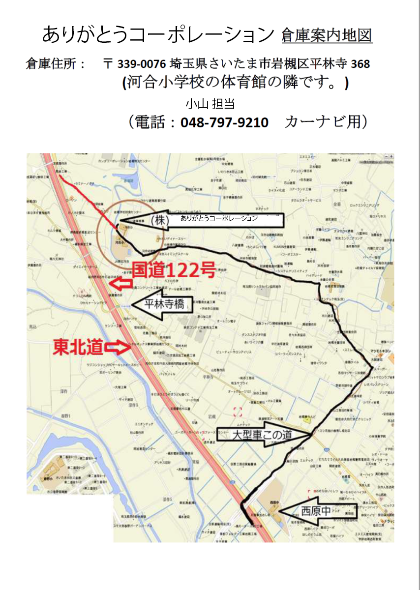 弊社倉庫案内地図です。 倉庫住所:さいたま市岩槻区平林寺368 最寄り駅:蓮田駅から徒歩30分