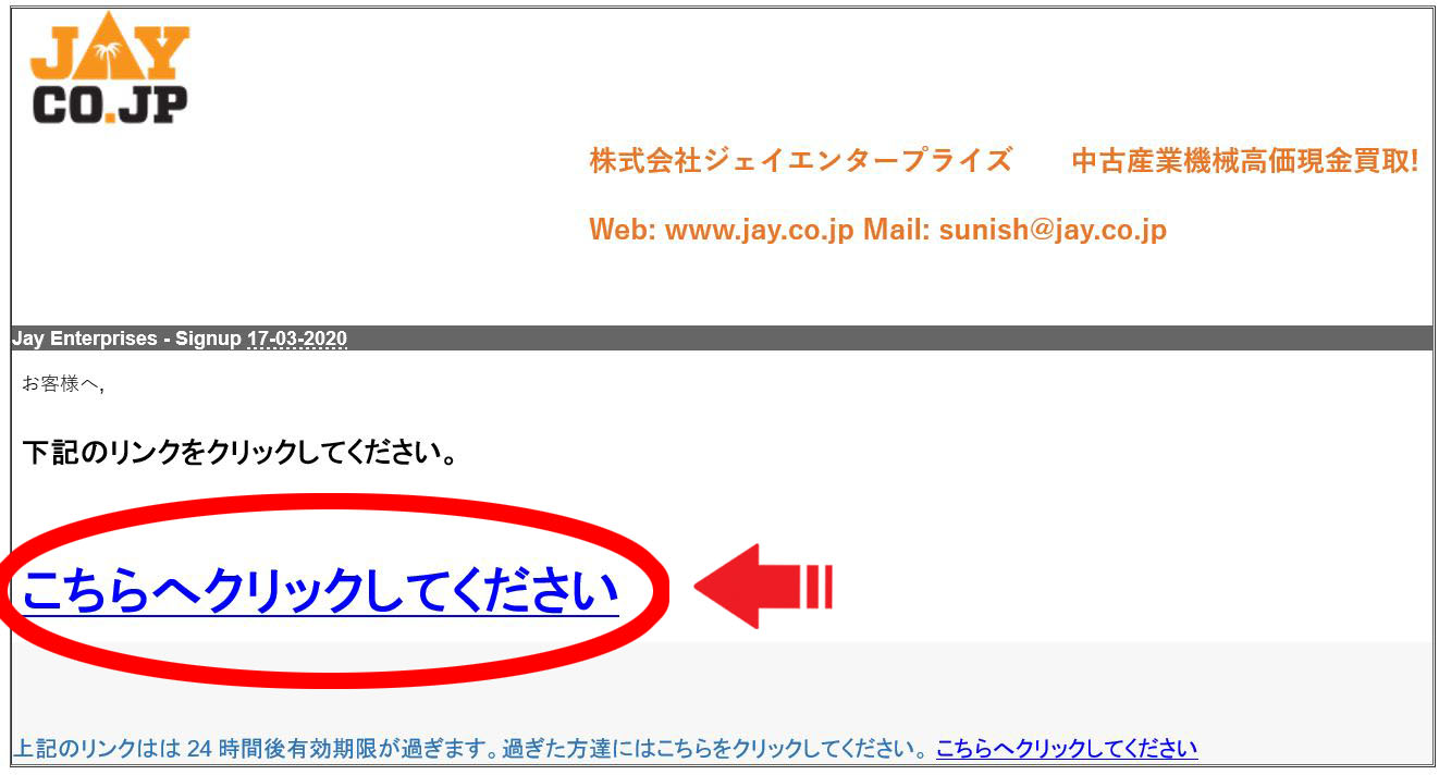 4. その後、自動メールが届きますので、そちらにある[こちらへクリックしてください]をクリック